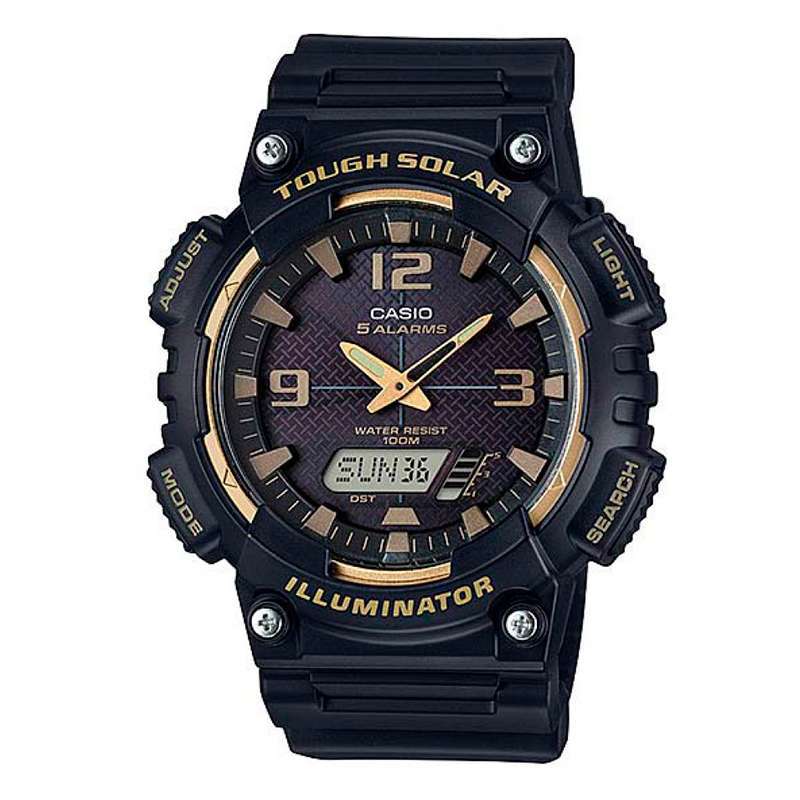 Reloj deportivo Casio para hombre con diseño resistente y funcional en tono negro. Dispone de caja de resina de 52 mm, pantalla combinada analógica-digital y correa de resina liviana. Funciona con tecnología solar Tough Solar, incorporando hora mundial, cronómetro, alarmas y luz LED, protegido con mica resistente y resistencia al agua de 100 m. Su durabilidad y múltiples funciones lo hacen ideal para actividades diarias y al aire libre.